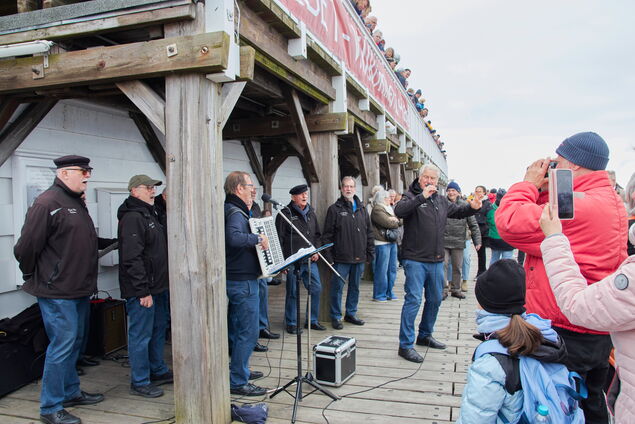 Als die Heimkehrerin, die auf der Strela Werft in Stralsund eine Verjüngungskur erfahren hatte, in Sichtweite kam, hob der Shanty-Chor Cuxhaven auf der "Alten Liebe" zu einem Platzkonzert an.