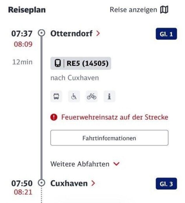 Der Zug erreichte Cuxhaven schließlich um 8.21 Uhr statt der vorgesehenen Ankunftszeit um 7.50 Uhr. Als Grund für die Verzögerung wurde in der App ein "Feuerwehreinsatz auf der Strecke" angegeben. Wo genau dieser Einsatz stattgefunden haben soll, ging aus den Daten nicht hervor. Aus den Verspätungen ließ sich lediglich erahnen, dass sich der mutmaßliche Einsatz irgendwo zwischen Neuhaus und Hamburg ereignet haben könnte.
