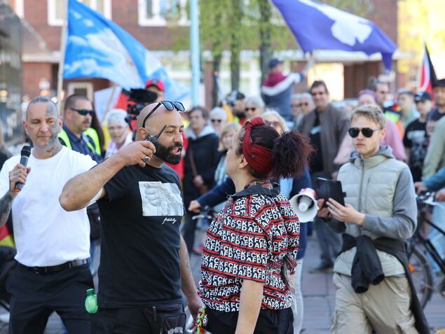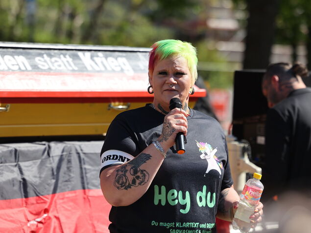 Es war keine homogene Gruppe, die da in Cuxhaven nach dem GfD-Aufruf auf die Straße ging. Viele Teilnehmende waren unauffällig. Und doch stachen einige Personen aus der Menge, wie ein maskierter schwarzer Sensenmann oder die selbst ernannte "bunte Pummelfee". Diese Frau mit grell-bunt gefärbter Kurzhaarfrisur trat am Nachmittag auch vor das Mikrofon. "Ich sehe es nicht ein, dass wir Welt-Sparkasse spielen", monierte sie bei der Zwischenkundgebung und forderte unter anderem, dass man wieder auf die Straße gehen könne, ohne Angst haben zu müssen, "abgeschlachtet oder vergewaltigt zu werden".