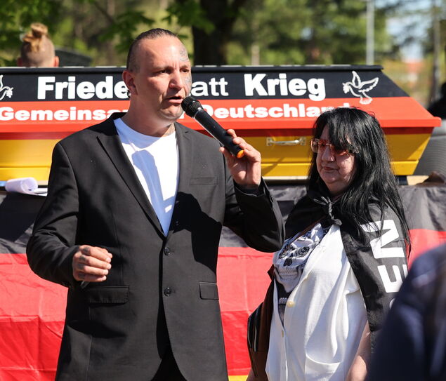 Mehr als zwölf Minuten dauerten gleich zu Beginn Hilses Erläuterungen der umfangreichen Versammlungsregeln, die er mit hämischen Untertönen spickte. Ein schwarz-rot-gold bemalter Sarg mit der Aufschrift "Frieden statt Krieg - Gemeinsam für Deutschland" stand dabei neben dem Mann mit den markanten Tätowierungen in der gesamten linken Gesichtshälfte.