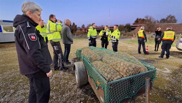 Ein Autofahrer hat einen alten Holzanhänger mit Kartoffeln dabei. Zugelassen ist er für 400 Kilogramm. Beladen ist er nach Polizeiangaben mit 700 Kilogramm - eine Verkehrsordnungswidrigkeit.