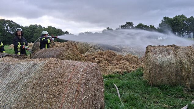 Als die ersten Einsatzkräfte wenige Minuten später eintrafen, standen bereits zahlreiche Heu- und Silage-Rundballen in Flammen. Die Feuerwehr begann umgehend mit einem umfassenden Löschangriff. Insgesamt fielen etwa 100 Rundballen den Flammen zum Opfer.