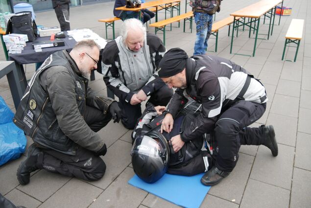 Mitglieder hatten einen interessanten Informationsstand aufgebaut, an dem Fragen beantwortet wurden. Ein Höhepunkt waren Informationen über die Notfallversorgung nach Unfällen mit dem Motorrad und Vorführungen, wie zum Beispiel die Helmabnahme mit anschließender Erster Hilfe und Betreuung bei einem verunfallten Biker. Der Programmpunkt fand großen Anklang, denn jeder der Anwesenden hatte die Gelegenheit, dieses einmal selbst mit seinem eigenen Helm auszuprobieren.