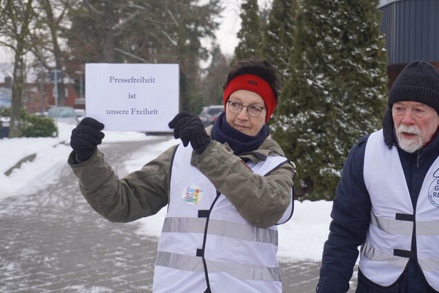 Die Omas greifen erneut zu Plakaten. Darauf steht Artikel 5 des Grundgesetzes. Die Freiheit der Berichterstattung. "Pressefreiheit ist unsere Freiheit", ruft eine von ihnen.