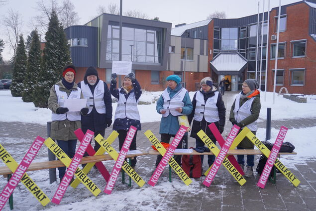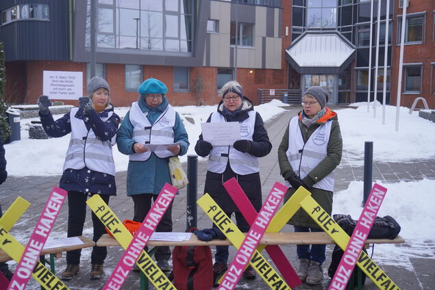 Hemmoor. "Heute vor 93 Jahren, am 30. Januar 1933, ernannte der damalige Reichspräsident Paul von Hindenburg Adolf Hitler zum Reichskanzler." Die Worte hallen über den verschneiten Rathausplatz in Hemmoor. Es ist Wochenmarkt und viele Menschen sind zum Einkaufen in Hemmoor unterwegs. Fünf Omas und ein Opa gegen Rechts stehen zwischen gelb-pinken Kreuzen. Darauf steht: "Kreuz ohne Haken - Für Vielfalt".