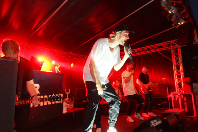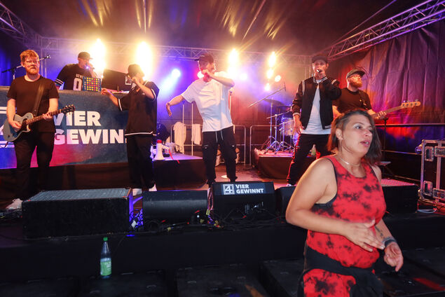 "Vier gewinnt", die Tributeband der Fanta 4 erklomm mit sieben Musikern die Bühne, und schon bei den ersten Takten gingen die Hände hoch und vor der Bühne wurde gehippt und gehoppt. Tanzeinlagen auf und vor der Bühne waren recht halsbrecherisch und zeigten, wie ausgelassen die Stimmung war. Ältere Semester, Mütter mit Kindern, auch die Kleinen vorneweg zappelten schon, was das Zeug hielt. Und die Musik ging richtig in die Beine. Treibende Bässe, groovige Lines, hippe Ansagen. "Die da!?", "Was geht?", "Sie ist weg", "MFG", "Troy" oder"Zusammen" waren nur einige Highlights, die das Publikum dankbar aufnahm.
