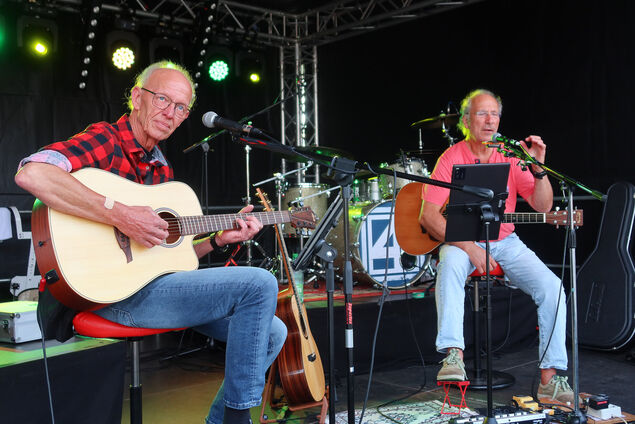 "Seit der Coronazeit spielen wir zu zweit", erzählten die beiden Musiker. "Ich habe mit 12 Jahren angefangen, verschiedene Instrumente zu spielen, und habe mir alles selbst beigebracht", sagte Burkhard und freute sich, dass seine Familie mit den Enkeln kam. "Auf rostigen Saiten haben wir angefangen", ergänzte Korly. 90 Stücke querbeet haben sie im Repertoire, vom "Griechischen Wein" bis zu Abba. Da sie als Vorband eine Stunde die Bühne für sich hatten, wurden 12 Stücke ausgewählt - bekannte Songs aus Rock und Pop auf eigene Art neu interpretiert. Den Anfang machte ein Stück von Status Quo. Ganz entspannt und fast schon ein bisschen folkig.