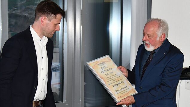 Nach den Wahlen war vor der Ehrung: Wolfgang Fels ist seit Mittwochabend Ehrenvorsitzender der Unternehmergemeinschaft. Sein langjähriger Stellvertreter Klaus Winter hob in seiner Rede dessen Verdienste und Tatkraft hervor: "Du warst mit Leib und Seele dabei, hast vieles organisiert und vorangebracht; eben ein Antreiber und Vorbild für uns." Dass Fels so viel Zeit in das Ehrenamt investieren konnte, sei auch dessen Ehefrau zu verdanken, die ihm dafür den Rücken freigehalten habe.