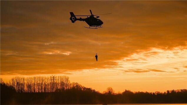Einsatzkräfte werden vom Boot zum Hubschrauber gezogen