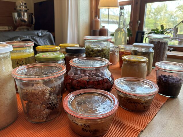 "Ich habe da mal was vorbereitet", sagt die 61-jährige Martina Jost und zeigt auf ihren Küchentisch. Darauf stehen in Weckgläsern eingekochte, eingelegte, getrocknete und fermentierte Lebensmittel. An der Küchenlampe hängt ein Kleiderbügel, von dem Rosmarin herunterbaumelt und getrocknet wird.