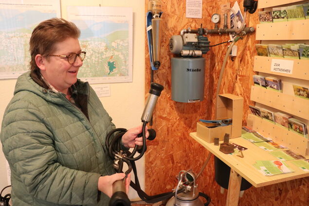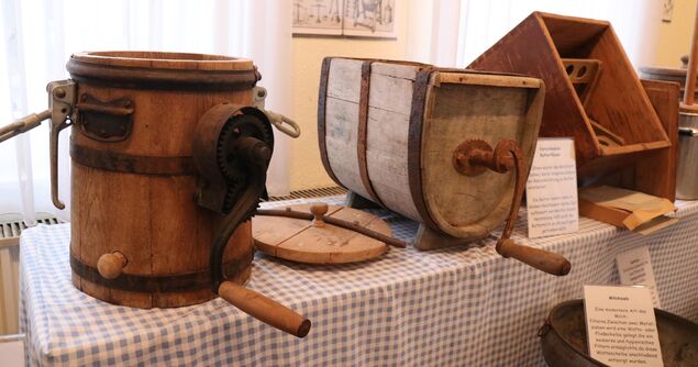 Es ist eine Ausstellung zum Staunen und Mitmachen. Die Besucher können zahlreiche historische und moderne Geräte zur Milcherzeugung und -verarbeitung bewundern - vom Milchtank und der Handmilchpumpe bis zum Seihtuch und dem Melkerfahrrad. An einer noch funktionierenden Melkanlage, wie sie vor 50 Jahren in kleinen Kuhställen zu finden war, erleben kleine und große Besucher hautnah, wie das Melkgeschirr am Euter arbeitet.