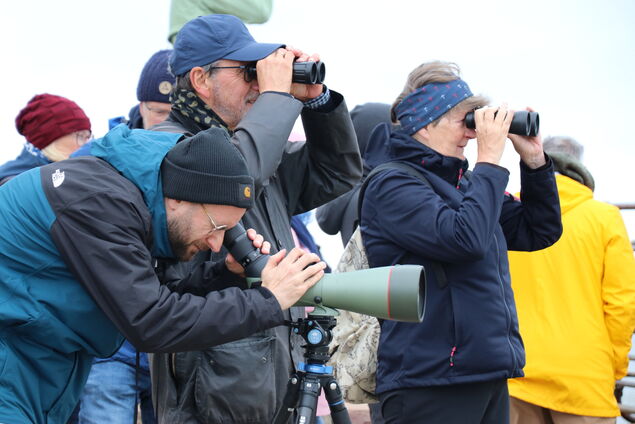 Jan Verbücheln ist extra wegen der Zugvogeltage aus dem Allgäu angereist und "outet" sich als Fan aller Tierarten. "Ich freue mich über alles, was ich vor die Linse bekomme", sagt der Urlauber und nimmt eine Gruppe von Eiderenten fotografisch ins Visier. Neben ihm steht Thomas Lang aus Cuxhaven, der in seinem Vogelbuch blättert, um die unterschiedlichen Möwenarten auseinanderhalten zu können. "Ich mache hier nicht zum ersten Mal mit", sagt der Naturfreund. Er sei zwar kein Experte, aber doch sehr an der heimischen Fauna interessiert.