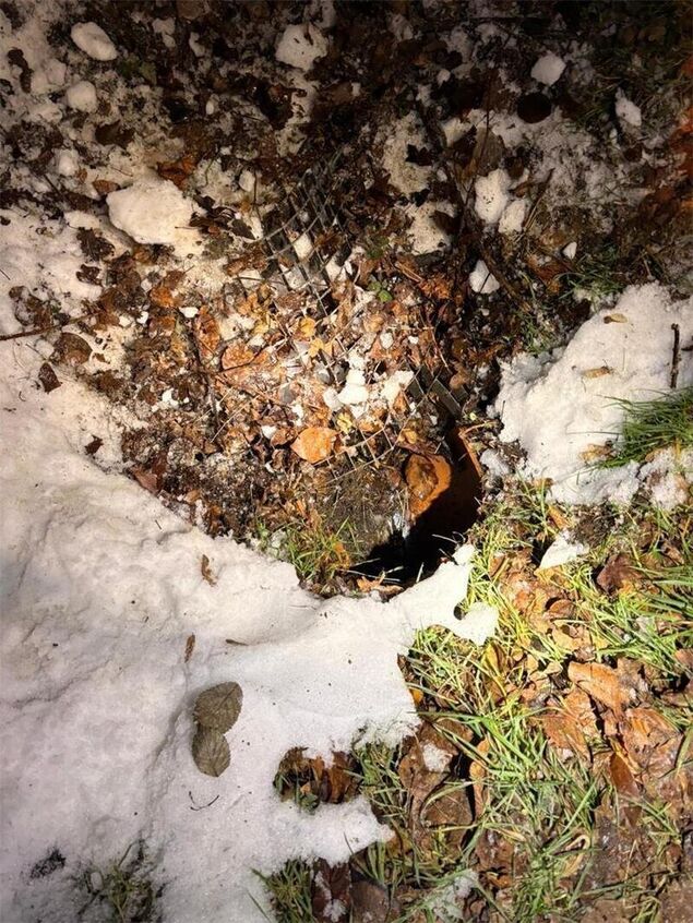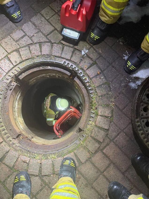 Auch die eintreffenden Feuerwehrleute hörten das Miauen aus der Oberflächenentwässerung. Sie öffneten die Kanäle und lokalisierten den Kater in dem verzweigten Rohrsystem rund zweieinhalb Meter unterhalb der Straße. Offenbar war der Kater durch ein kaputtes Rohr, das die Oberflächenentwässerung zu einem Graben führen sollte, in die Oberflächenentwässerung geraten. Hier irrte er umher, fand wohl keinen Weg nach draußen. Mit Finesse und Geduld konnten die Feuerwehrleute helfen.