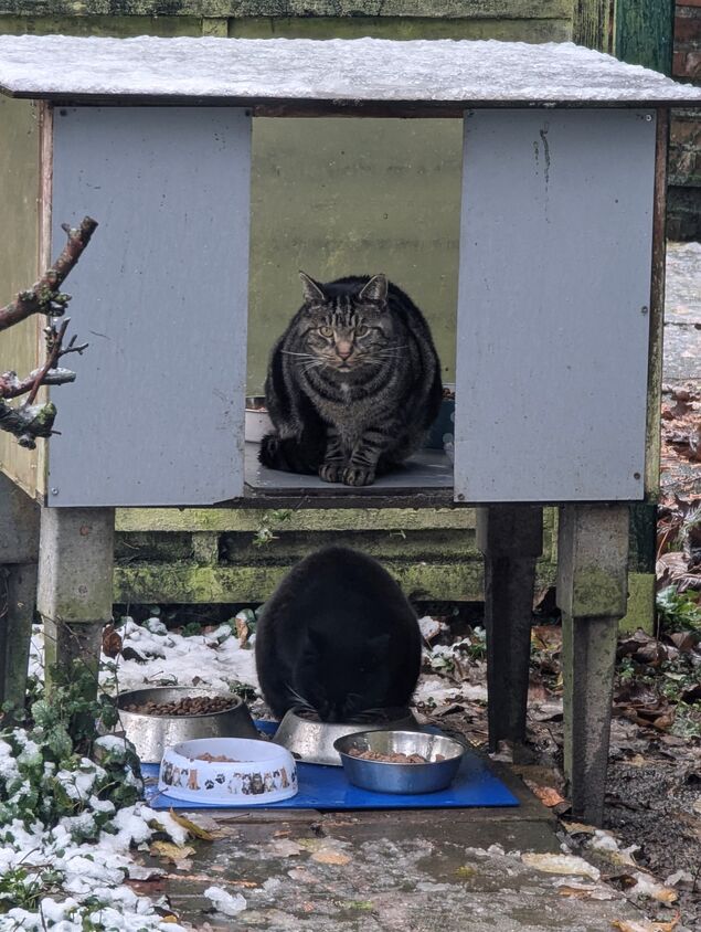 Es schneit schon seit mehreren Stunden. Die Stadt ist überzogen mit weißem Schnee und so auch die Futterstelle der Katzenhilfe. Es sieht aus wie ein normaler Garten, mit Apfelbaum, einem Strandkorb und Geräteschuppen.