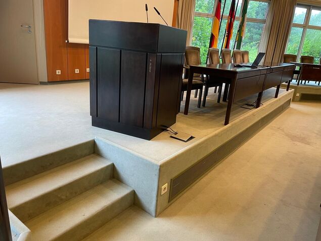 Die Sitzungssäle werden nicht nur von der Politik genutzt - hier finden auch öffentliche Veranstaltungen statt - von Blutspenden bis Infotage. Landkreis-Pressesprecherin Simone Starke und Carina Kattenberg vom Bereich Liegenschaften machen gegenüber unserem Medienhaus deutlich: "Der Fokus der Gesamtmaßnahme liegt auf technischen und gestalterischen Verbesserungen", In der Gesamtmaßnahme sind ihnen zufolge die folgenden inklusionsgerechten Maßnahmen geplant: Das Rednerpult wird ebenerdig montiert und zusätzlich schwenk- und höhenverstellbar. Die Bühne bekommt zusätzliche Handläufe. Für einen barrierefreien Zugang zur Bühne wird eine elektrisch betriebene Treppe/Hebebühne eingebaut. Die Stufen werden mit sichtbaren Antirutsch-Kantenprofile versehen.