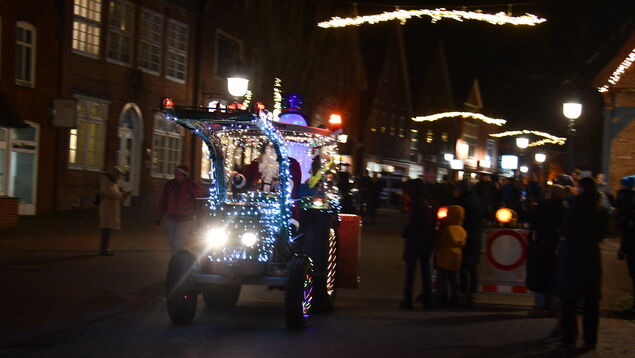 Freitagabend beim Parkplatz "Am großen Specken" in der Medemstadt: Wo sonst nur Autofahrer ihren Wagen abstellen, funkelt es kunterbunt an betagten Traktoren oder alten Autos. Der Fantasie sind dabei keine Grenzen gesetzt. Ob "Merry Christmas"-Schild, ein mannshoher und aufblasbarer Plastikschneemann oder meterlange Lichterketten: Es wird wieder einiges geboten. Vorwiegend Kinder mit ihren Eltern kommen zum Treffpunkt, von dem aus die Tour durch Otterndorf startet und auch entlang des Weihnachtsmarktes in der historischen Altstadt führt. Zahlreiche Fotoapparate und Handys werden gezückt, um dieses Ereignis im Bild festzuhalten.