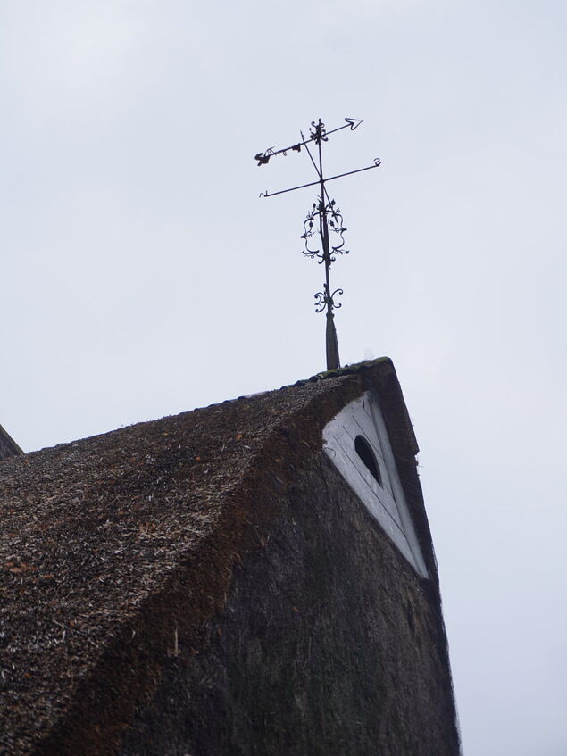 In diesem Jahr unterstützte die DSD die Reetdachsanierung auf der Westseite des Hauses Seth 2 mit 37.500 Euro, bei Gesamtkosten von 75.000 Euro. "Zum vierten Mal habe ich es jetzt erlebt, dass das Dach neu eingedeckt wird", erzählt Uwe-Karsten Tiedemann, der Vater von Dirk Tiedemann, der seit seiner Geburt in dem Haus lebt. Unter dem Wetterhahn auf dem Dach fehlen zwar ein paar Buchstaben, doch angebracht wurde er einst von Dirk Tiedemanns Urgroßvater Barthold Tiedemann. Eigentlich sollte das Eindecken rund fünf Wochen dauern - letztlich wurden über zwei Monate daraus, so Dirk Tiedemann.
