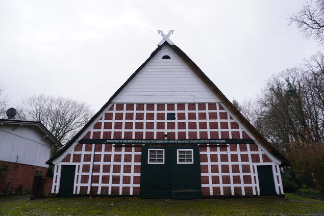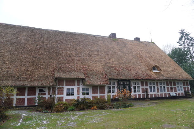 Seit über 500 Jahren lebt die Familie auf dem Grund und Boden, auf dem auch das denkmalgeschützte Haus steht - aktuell mit drei Generationen. Das zentrale Gebäude ist ein Zweiständerbau von 1861 - ein langgestrecktes Fachwerkhaus mit Backsteinausfachung, reetgedecktem Satteldach und ortstypischen Gestaltungselementen wie Halbwalm, Brettverschalung am Wirtschaftsgiebel und den charakteristischen Niedersachsenpferden als Giebelzier. Ergänzt wird das Ensemble durch weitere historische Nebengebäude wie Kornscheune, Melkerhaus und Stall. An der Tür des Hauses ist die Zahl 1861 zu finden.