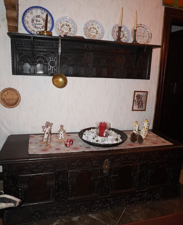 Auch im Inneren des Hauses finden sich viele Spuren der Vergangenheit. Eine alte Truhe bewacht Friedel Tiedemann wie ihren Augapfel. An den Wänden der Diele hängen Fotos der Vorfahren und ein altes Wappen, das für die Familie nachgezeichnet wurde. Die Scheune wird von der Familie nicht mehr für Tiere genutzt, wie auch der Heuboden. Am Giebel befindet sich eine Uhlenflucht, also ein Eulenloch. Ein Durchlass, der dem Rauchabzug diente und auch den Eulen Unterschlupf bot, die den Heuboden mäusefrei hielten.