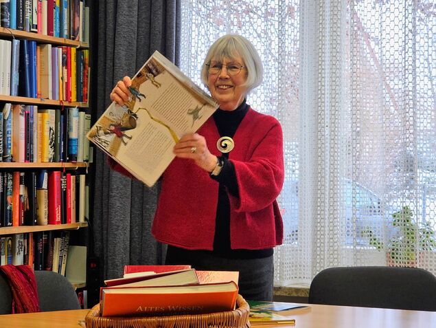 Bereits 2011 wurde die Bücherstube gegründet. Ein kleiner Raum im Gemeindehaus gleicht einer Bibliothek, mit deckenhohen Regalen, voll mit Büchern. "Aber wo sind denn eure Enkel", fragt Kirchberg lachend als sie in die Runde schaut - "ich bin doch Kinderbuchautorin."
