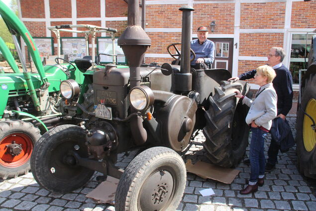 Für ordentlich Kikeriki sorgten die Hähne, die der Otterndorfer Rassegeflügelzuchtverein auf dem Rathausplatz ausstellte. Die Schreie der Hähne wurden nur übertönt vom Motorentuckern der gegenüber aufgestellten Oldie-Trecker. Darunter waren echte Schätzchen, so wie der Lanz-Bulldog aus dem Jahr 1936 des Otterndorfers Max Mohr.