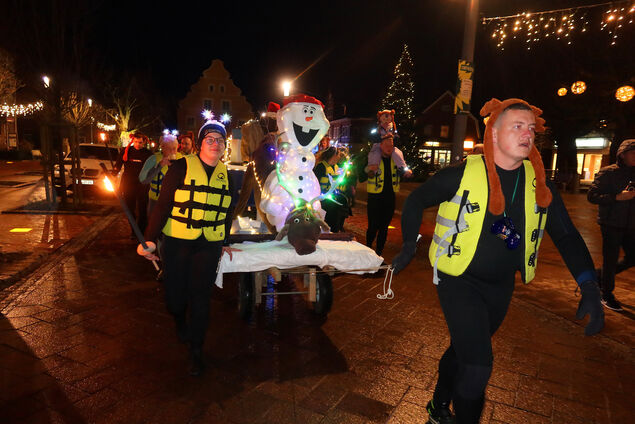 Angeführt vom Otterndorfer Spielmannszug, begleitet von der Polizei und der örtlichen Jugendfeuerwehr, zog der Taucher-Fackelzug mit seinen fantasievoll geschmückten Flößen von der Sole Therme in Richtung Baar-Rabe-Brücke. Das Wasser der Medem hatte knapp über null Grad Celsius und war alles andere als ein entspanntes Badegewässer. "Wir haben Stellen gesehen, die schon zugefroren waren", kommentierten die Hamelner Taucher, fügten aber hinzu: "Das Fackelschwimmen fand aber auch schon bei Eisgang statt.