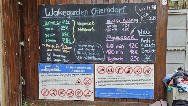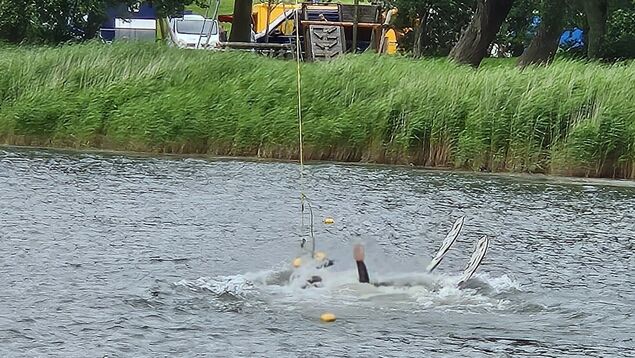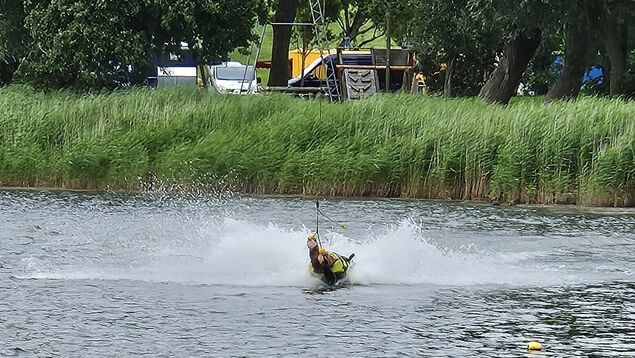 Zusammen mit Reimers geht es zum Steg der Wasserskier und der Wakeboard-Anlage. Zum Start gibt er mir ein paar Tipps: "Arme lang lassen", rät er mir. Das fällt anfangs schwer. Ich lasse mich der Länge nach - ohne Bretter - durchs Wasser ziehen und mache mich über Drehungen auf der Wasseroberfläche mit der Geschwindigkeit und dem Gefühl vertraut. Mein Fazit: Wenn mir nicht gerade Wasser ins Gesicht spritzt, macht es Spaß. Aber das Wasser des Sees sei gut für die Nase, meint Ron schmunzelnd.