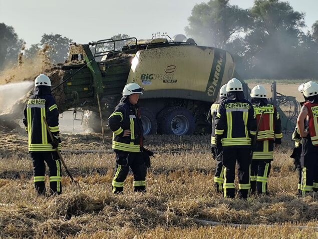 Später wurden die Einsatzkräfte zu einem Treckerbrand nach Otterndorf-Assel gerufen. Als die ersten Feuerwehrleute eintrafen, stand die Strohpresse bereits in Vollbrand. Da Teile des gepressten Strohs brannten, bestand die Gefahr, dass sich das Feuer weiter ausbreiten würde. Die Feuerwehr Neuenkirchen wurde umgehend nachalarmiert.