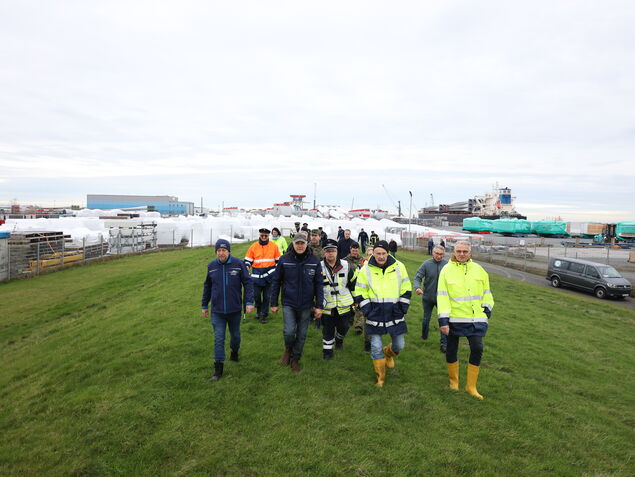 Die diesjährige Herbstdeichschau begann nicht wie üblich, sondern mit einem kurzen Abstecher zur Großbaustelle. Knut Kokkelink, Niederlassungsleiter von Niedersachsen Ports, zeigte den Anwesenden die Fortschritte beim Bau der neuen Liegeplätze 5-7. Auch Oberbürgermeister Uwe Santjer gab einen kurzen Ausblick auf das, was in den kommenden Monaten alles im Hafen passieren soll. Anschließend ging es an den großen Turbinen von Siemens Gamesa vorbei auf den Deich.