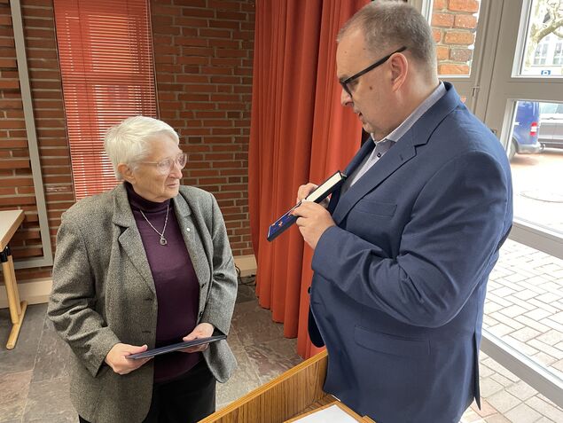 "Die Netzwerke, die du geschaffen hast in deiner Arbeit, sind die, die jetzt tragen in düsterer Zeit", lobte Maria Jarowoy. Gemeinsam mit Elina Sieber und Hermann Kleist hatte sie die wertschätzenden Beiträge der zahlreichen weiteren Wegbegleiter organisiert und eine Erinnerungsmappe an einen besonderen Tag zusammengestellt, der sich als historisch herausstellen sollte, denn laut Bürgermeister Claus Johannßen hat niemals zuvor eine Otterndorferin das Bundesverdienstkreuz erhalten.