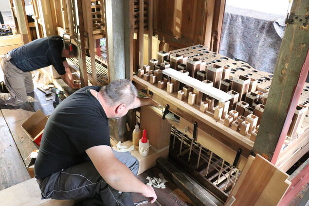 Mit schnellen Händen arbeiten Tischlermeister Markus Collmann und seine Kollegen, regulieren Tasten ein, drehen Schrauben und behandeln Lederdichtungen. Für einen Laien kaum vorstellbar, dass die Teile wieder alle ihren angestammten Platz finden. "Keine Sorge, wir machen das nicht zum ersten Mal", sagt Collmann.