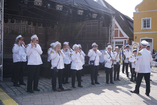 Auf der Bühne am Kirchplatz fanden eine Live-Yoga-Session und musikalische Darbietungen statt - unter anderem vom Spielmannszug Otterndorf, der moderne Stücke interpretierte. Utröper Jürgen Schwanemann führte durchs Programm.