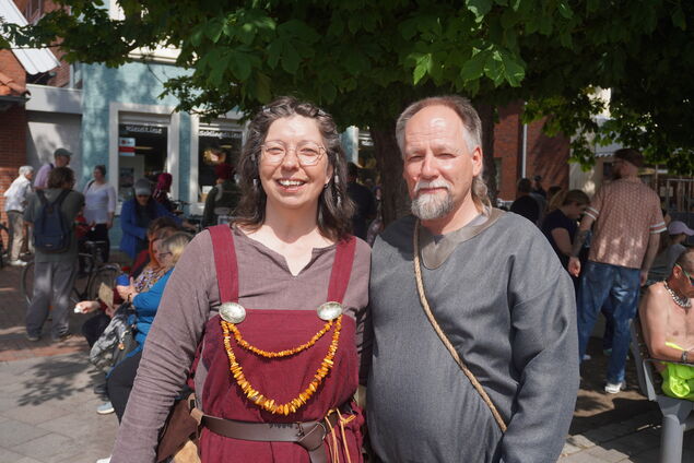 Auf der Festmeile konnten sich die Gäste mit Burgern, Pommes, Bratwurst und kühlen Getränken stärken. Auch Angela Schliefkowitz war dabei - eigens mittelalterlich gekleidet. 50 der 625 Jahre hat sie in Otterndorf miterlebt. "Meinen Mann habe ich vor 17 Jahren mit reingezogen", erzählte sie lachend. Thorsten Schliefkowitz stammt gebürtig aus Wanna.