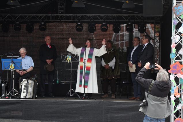 Schon bevor der Festumzug zum 625. Stadtgeburtstag durch die Straßen von Otterndorf zog, begann die Feier rund um den Kirchplatz. Vor Traumkulisse gab es von der Bühne herunter eine offizielle Begrüßung und Einstimmung, eingeleitet durch Superintendentin Kerstin Tiemann mit einer kleinen Andacht. Sie ruf zur Besinnung und zum Zusammenhalt in schwierigen Zeiten auf und spendete der Stadt Otterndorf und allen Gästen ihren Segen.