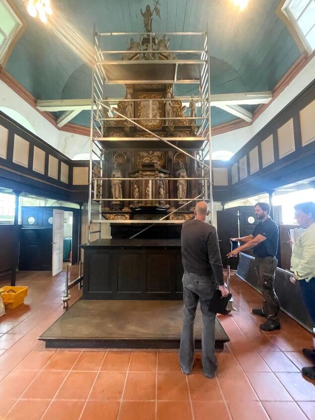Für die Sanierung wurde im sechs Meter hohen Kirchensaal alles Abnehmbare abgebaut, eingerüstet oder eingelagert: der Taufengel, die Bänke, der Hochaltar, die Orgel. Erst dann konnten die Fachleute dem Putz zu Leibe rücken, der seit Jahren kontinuierlich abgeplatzt war. Es staubte gewaltig, und das fortwährende Hämmern war nichts für empfindliche Ohren. Doch der Einsatz lohnt sich, auch wenn noch nicht alles fertig ist.