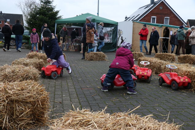 In ein festliches Gewand gehüllt war am Sonntag die Alte Meierei in . Bereits zum 27. Mal organisierten die Gemeinde und die ortsansässigen Vereine einen Weihnachtsmarkt mit vielen Hobbykünstlern, Spiel- und Bastelaktionen und allerlei Köstlichkeiten - vom geräucherten Aal bis zur Bratwurst. Für die Kinder stand in der Mitte des Parkplatzes ein aus Strohballen gebauter Bobbycar-Rundkurs bereit, den die kleinen Besucherinnen und Besucher eifrig nutzten. Der Posaunenchor Ihlienworth sorgte mit weihnachtlichen Melodien für die musikalische Umrahmung der Veranstaltung.