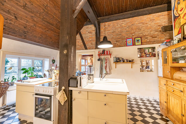 Die in dem Immobilienangebot veröffentlichten Fotos erlauben einen virtuellen Rundgang durch die Reetdach-Idylle, angefangen von der luftig gestalteten Eingangshalle mit ihren markanten, alten Balken bis zur romantischen Küche mit Kochinsel, Essecke und Speisekammer.