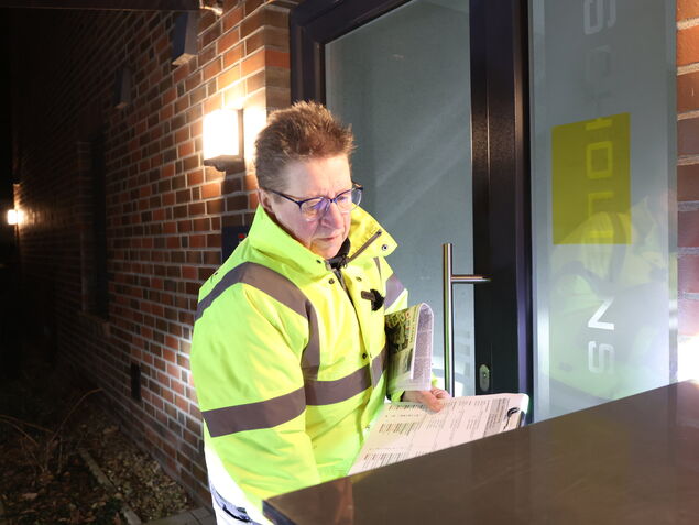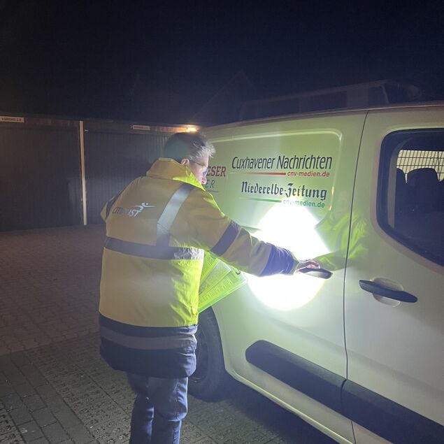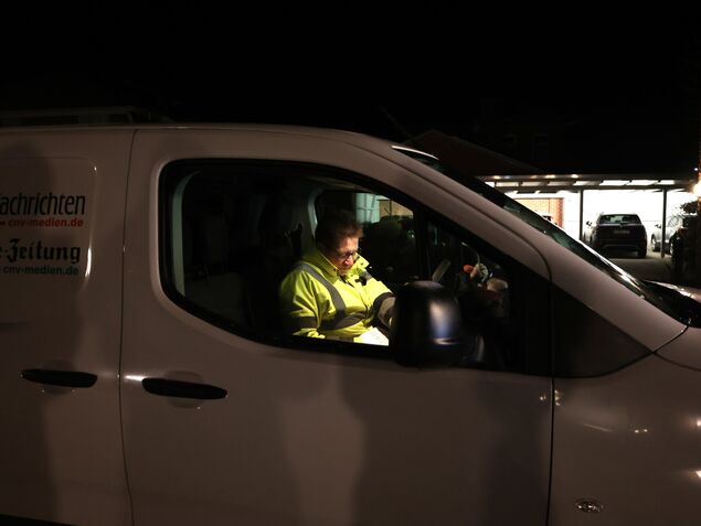 Nachts um drei Uhr stehe ich auf dem Edeka-Parkplatz in Otterndorf. Es ist eisig kalt, dunkel und keine Menschenseele ist zu sehen. Ein Schild an einem Haus quietscht im Wind, es wirkt beinahe gespenstisch. Selbst beim Bäcker ist es noch dunkel. Bereits kurz vor zwei Uhr bin ich aufgestanden, geschlafen habe ich maximal vier Stunden. Auf dem Weg nach Otterndorf sind mir nicht mal eine Handvoll Autos begegnet. Kurz nach drei Uhr kommt Astrid Fürst mit dem Auto angefahren und sammelt mich ein. Die Zustellerin wirkt auf mich topfit - und das um diese Uhrzeit.