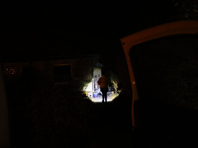 "Nachts ist nichts los, das ist super", findet die Zustellerin. Ihr wichtigstes Utensil zu der Uhrzeit: ihre Taschenlampe. In einer Straße erzählt sie, dass eine Kollegin hier einmal grüne Augen im Dunkeln gesehen habe. "Sie ist sich sicher, dass das ein Wolf war. Seitdem sind hier nachts die Straßenlaternen an." Sie selbst habe viermal einen Wolf gesehen. Aus Otterndorf fahren wir weiter nach Neuhaus. Vor allem die Strecken zwischen den Orten würden Zeit kosten, erklärt sie. Eine Anzeige im Auto zeigt minus fünf Grad. Handschuhe trägt die 62-Jährige nicht. "Mit Handschuhen kann man die Zeitungen nicht richtig packen", meint sie, als ich sie danach frage.
