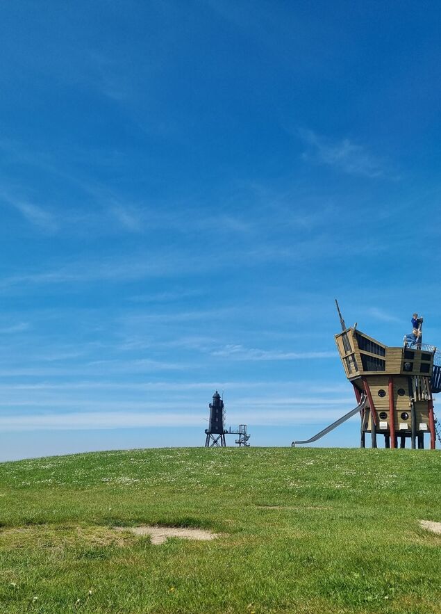 Am Rand des Deichvorlands in Dorum-Neufeld ragt ein schlanker, schwarzer Turm in die Höhe - das einstige Eversand-Oberfeuer. Gemeinsam mit drei weiteren, heute stillgelegten Leuchttürmen prägte es über ein Jahrhundert lang die Silhouette des Wurster Watts an der Außenweser. Das Eversand-Oberfeuer wurde 1886/87 erbaut. Der Piratenspielplatz in Dorum-Neufeld bildet einen interessanten Kontrast zum Leuchtturm. An den Hafenterrassen Dorum-Neufeld befindet sich ein Parkplatz.