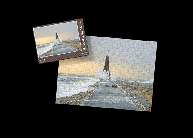 Die Kugelbake breitet sich vor dem Betrachter aus, zersplittert in 1000 Teilen auf dem Tisch. Ein Sturm tobt und die hohen Wellen überspülen die hölzernen Füße des Seezeichens. Setzt man Teil für Teil des maritimen Motivs aneinander, fügt sich das Puzzle langsam zusammen.