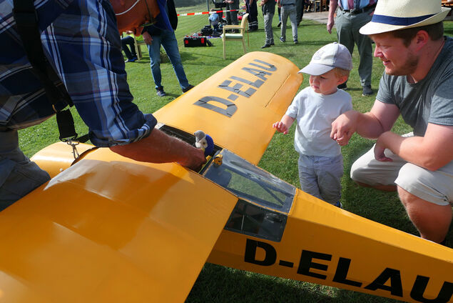 Abgesichert wurde das Feld von den Flugleitern Wilfried Meyer und Walter kurz. "Das ist wichtig wegen der Straße und natürlich auch wegen der Kinder." Als ein Flugzeug Bonbons abwirft, sorgten sie dafür, dass die Kleinen sicher beim Aufheben auf der Flugbahn waren. "Holt euch eine Boardingcard für eure Kuscheltiere", sagte Wolfgang Knäbel, der als Ansager fungierte. Der zweijährige Leander war der Erste, der seinen Papagei mitfliegen ließ. Man sah dem kleinen Jungen an, wie aufregend er den Flug seines Papageis fand.
