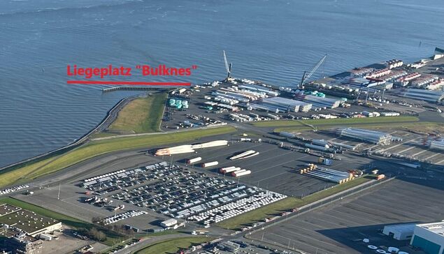 Jetzt, wo der Bau der Fläche beginnen soll, muss Material auf die Baustelle und das ist eine echte Herausforderung. In den kommenden Monaten werden per Schiff bis zu 1.000.000 Tonnen Splitt für die Schottertragschicht angeliefert, die dann von der Firma Bodo Freimuth verarbeitet werden sollen. Den Anfang machte am Montag der Massengutfrachter "Bulknes" mit den ersten 26.000 Tonnen.