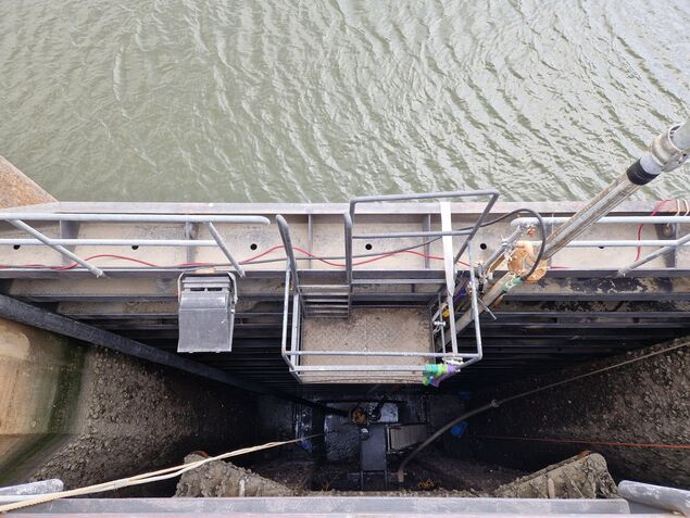 Um den Unterwasserbereich erreichen zu können, wurde das 26 Meter lange und sechs Meter breite Tor zunächst in den seitlichen Betonschacht eingedockt, in den es in geöffnetem Zustand hineinfährt. Anschließend wurde der Schacht mit Stahlplatten zur Schleusenkammer hin abgedichtet und ausgepumpt.