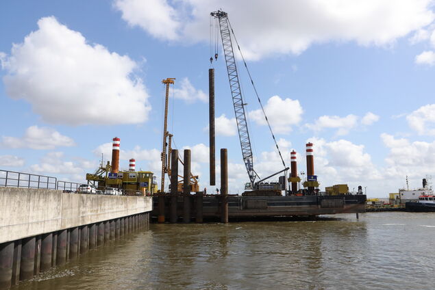 Begonnen hat mit dem Rammschlag am 6. Februar 2025 der Ausbau der Liegeplätze 5 bis 7. "Eines der größten Projekte in der Geschichte von NPorts", sagte Holger Banik am Donnerstag mit Blick auf die Großbaustelle. Während des Gesprächs im Baucontainer wurden im Hintergrund die rund 35 Meter langen "Rammrohre" gesetzt. Am Ende werden 400 Rohre den Verlauf der neuen Kaimauer markieren - bisher sind es fünf.