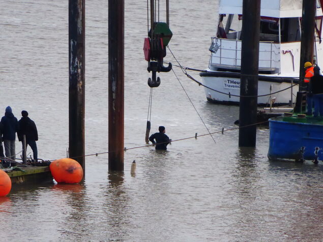 "Die Ketten, mit denen der Ponton befestigt war, hatten sich an den Haltepfählen verfangen, sodass der Schwimmkörper bei steigendem Wasser sank", erklärt der CYC-Vorsitzende Dieter Rudat. Gleiches war bereits im März 2023 mit einem Steg an der Alten Liebe passiert, an dem normalerweise das Ausflugsschiff "Störtebeker" festmacht. Hier beauftragte die Eigentümerin Niedersachsen Ports die Cuxhavener Schlepp- und Bergungsreederei Otto Wulf.