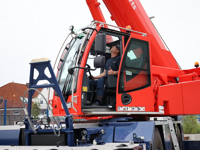 Zwei Kranführer sind bei NPorts für das neue Gerät zuständig. "Wir waren kürzlich zwei Tage in Süddeutschland bei Liebherr, um uns den Kran genau erklären zu lassen. Ein neuer Hersteller heißt auch, dass man alles neu lernen muss", sagt Kranführer Andreas Berndt, der zukünftig zusammen mit Tobias Walter im Einsatz ist und sich auf die Arbeit mit dem neuen Kran freut.