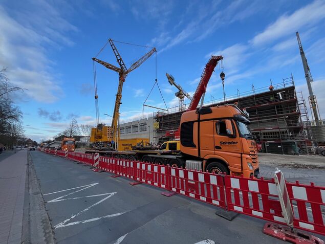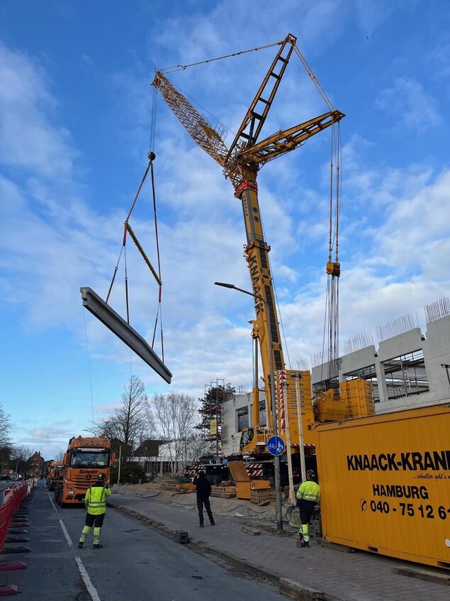 Es waren beeindruckende Bilder, die vor dem Neubau der neuen Sporthalle in Cuxhaven in den vergangenen Tagen zu sehen waren. Ein riesiger Kran, der allein 178 Tonnen wiegt und bis zu 650 Tonnen heben kann, hob nach und nach acht große Stahlbetonbinder auf die Hallenkonstruktion. Sie sollen das Dach der Dreifeldhalle tragen. Die Binder sind rund 38 Meter lang und wiegen jeweils 63 Tonnen. Es sind Spezialanfertigungen und aufgrund der Größe und des Gewichts durften diese massiven Bauteile nur nachts auf speziellen Lastkraftwagen bewegt werden. Daher auch die Straßensperrungen in den vergangenen Tagen an der Baustelle. Mit Einsetzen des letzten Binders ist diese wieder aufgehoben. Auch für den zuständigen Projektleiter des Landkreises Cuxhaven, Daniel Müller, keine Routinearbeit. Er schaute in den vergangenen Tagen noch öfter auf der Baustelle vorbei, als ohnehin schon. "Das ist schon etwas Besonderes", sagt er. Am Donnerstagabend wurden die letzten großen Stahlbetonbinder eingesetzt. Nebenbei gingen die Arbeiten in den anderen Teilen der Halle ungehindert weiter. Mitte Juni soll die Hülle der Halle laut Müller geschlossen sein. Ein straffer Zeitplan, denn schon im November soll der Sporthallenbau abgeschlossen sein.