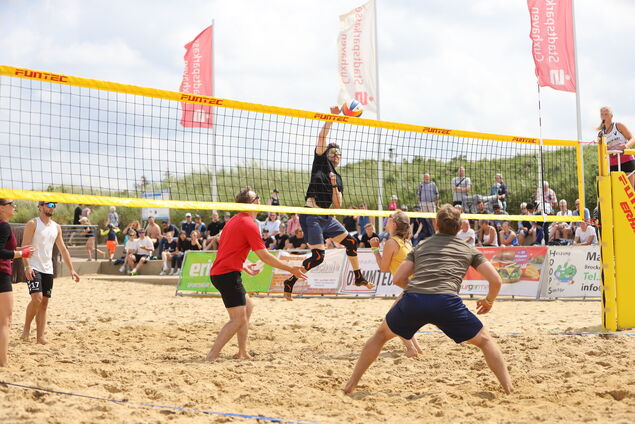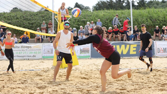 Beachvolleyball ist ein Hingucker. Am Strand von Cuxhaven waren am Wochenende rund 900 aktive Spielerinnen und Spieler beim 33. Mahrenholz-Beachvolleyball-Cup des BC Cuxhaven im Einsatz. Sie haben gebaggert, gepritscht und geschmettert. Sehr zur Freude vieler Zuschauer, die sich das Spektakel von der Promenade und von der Tribüne in der Sparkassen Beach-Arena anschauten. "Wir können sehr zufrieden sein", sagt Rüdiger Sauer, Turniermanager des BC Cuxhaven. Zusammen mit vielen helfenden Händen hat der Verein an drei Tagen versucht, beste Bedingungen zu schaffen. Insgesamt 27 Beachvolleyballfelder wurden aufgebaut, sodass von Freitag bis Sonntag fast rund um die Uhr die Bälle über die Netze flogen. Und auch das Wetter spielte größtenteils mit - trotz unsicherer Prognosen. Noch am Sonnabend wurde für Sonntag viel Regen und eine Gewittergefahr vorhergesagt. Die Turnierleitung entschloss sich kurzerhand dafür, am Sonnabend so viele Spiele wie möglich durchzuziehen. Der Plan sollte aufgehen. Auch, weil der Sonntag deutlich freundlicher daherkam als befürchtet. Erst zu den Finalspielen des A-Cups fing es an zu regnen. Das trübte den insgesamt günstigen Turnierverlauf am Wochenende aber nicht. "Es hätte uns deutlich schlimmer treffen können", sagte Sauer am Sonntagnachmittag.
