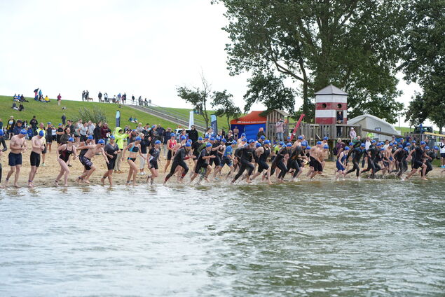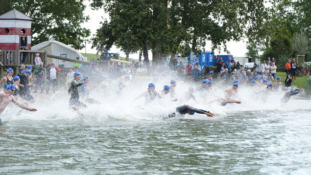 Kräftig blies der Wind über den See Achtern Diek in Otterndorf. Banner wehten im Wind, der aufblasbare Zieleinlauf wankte bedrohlich hin und her. Und mittendrin zahlreiche Sportlerinnen und Sportler - startklar, sich gleich ins kühle Nass zu stürzen.